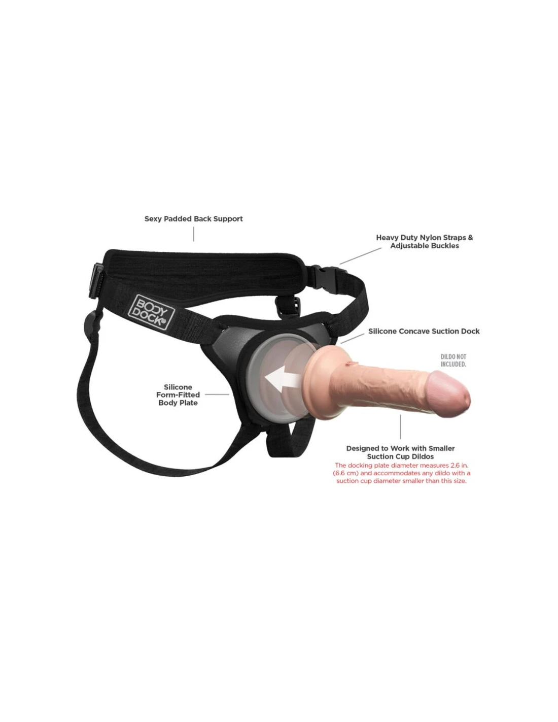 ¡El Body Dock Elite Mini patentado lleva el juego con arnés a un nivel completamente nuevo! Cuenta con una placa de acoplamiento de silicona premium que se adapta a la forma de tu cuerpo, hebillas ajustables de liberación lateral y soporte acolchado para la espalda. El Elite Mini fue diseñado específicamente para dildos con ventosas más pequeñas, ofreciendo un ajuste más pequeño. ¡Cambiar tu accesorio favorito de arnés nunca ha sido tan rápido o fácil! Es tan simple como adjuntar la ventosa de tu dildo o vibrador favorito a la placa de acoplamiento, mientras que las correas de nylon se ajustan fácilmente a la mayoría de tallas y tipos de cuerpo. Y lo mejor de todo es que funciona con la mayoría de los dildos disponibles en el mercado hoy en día, incluidos algunos que ya puedas tener. ¡Sin anillos. Sin broches. Sin complicaciones!