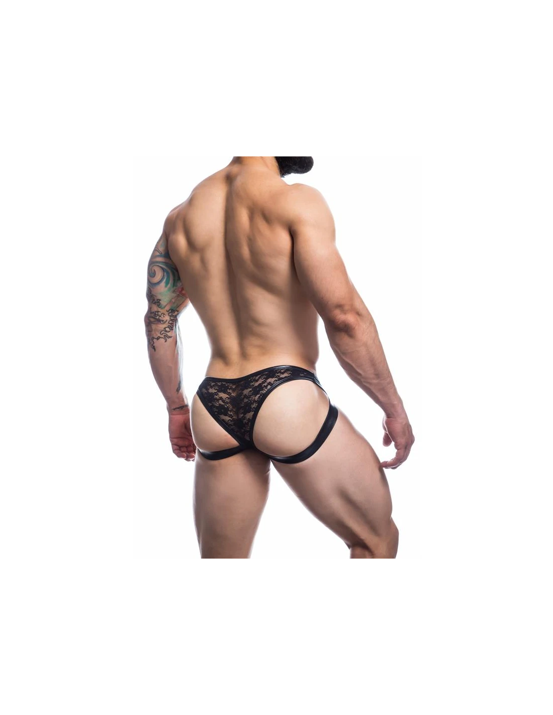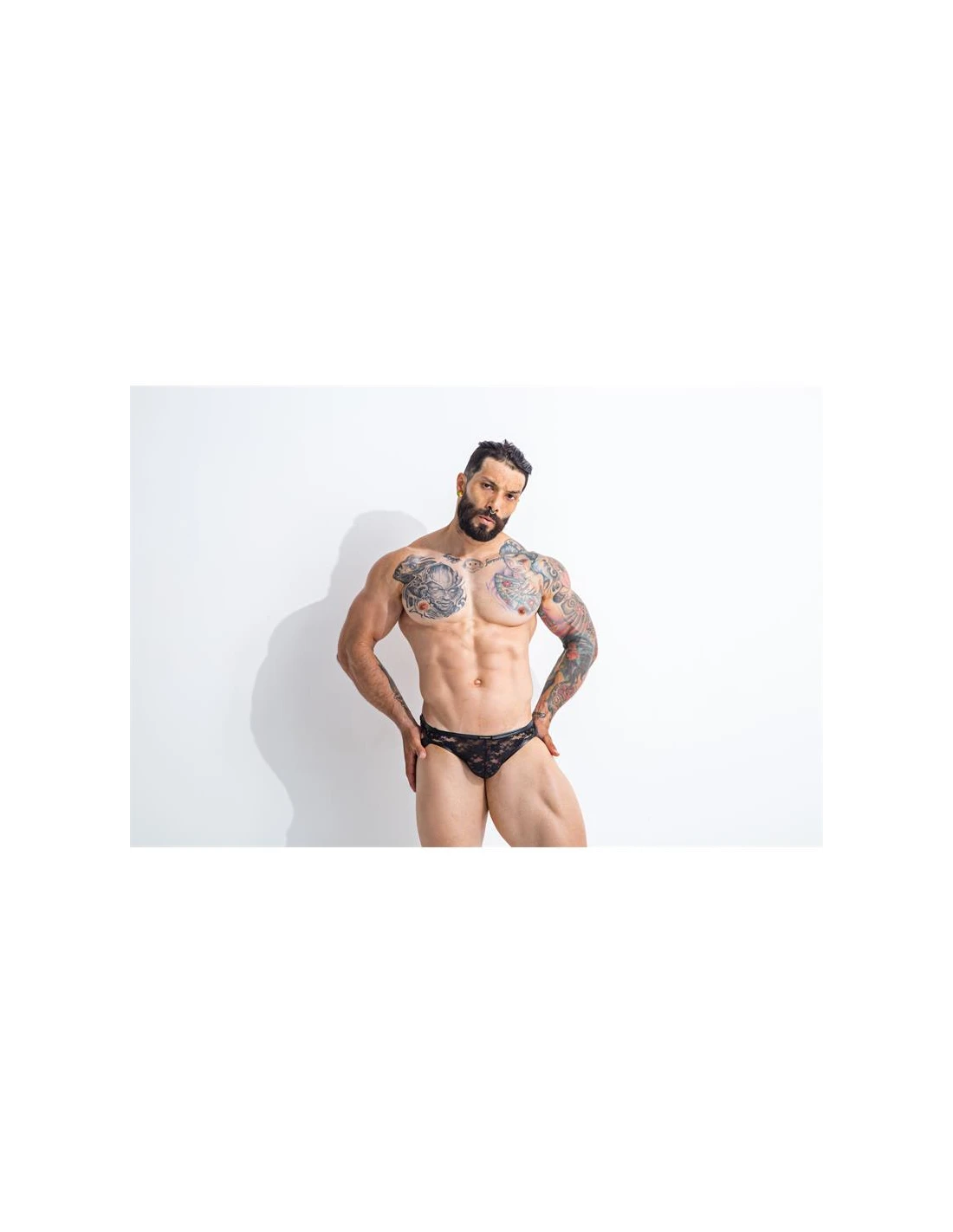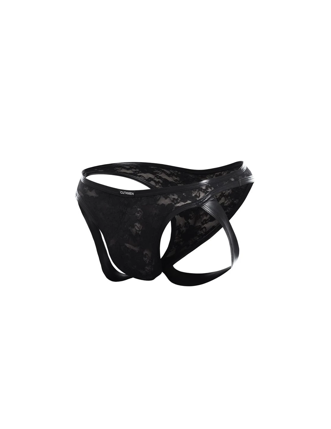 Este slip cuenta con un diseño con detalles de suspensorio, es elegante y sensual. Tanto la parte de la entrepierna como la parte trasera cuentan con un encaje semi transparente con patrón floreado, mientras que las tiras de la cadera y del suspensorio son en negro liso.